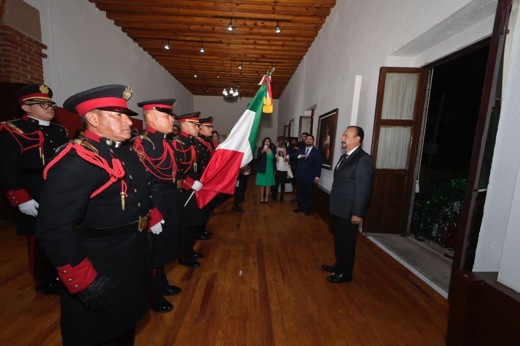 En punto de las 19:30 horas, después de los Honores a la Bandera, Rodríguez Villegas tomó en sus manos la Bandera mexicana y recordó a los padres de la patria que iniciaron la fundación de un México libre.