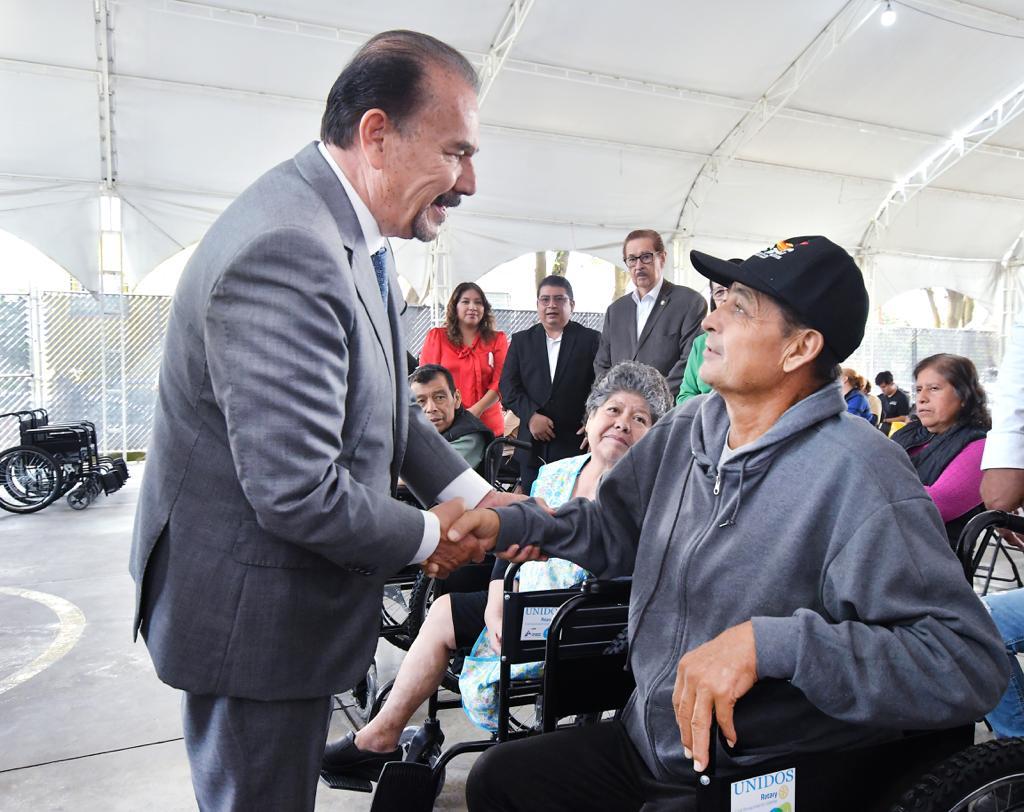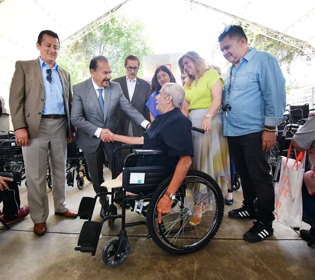 El Alcalde de Atizapán de Zaragoza, Pedro Rodríguez Villegas; la Presidenta del Sistema Municipal DIF, Patricia Arévalo Rubio, y miembros del Club Rotario Renacimiento Satélite entregaron 40 sillas de ruedas a mismo número de vecinas y vecinos del municipio con el objetivo de mejorar su calidad de vida.