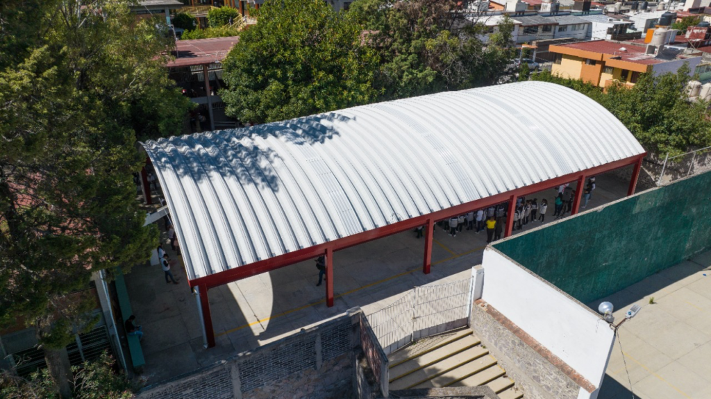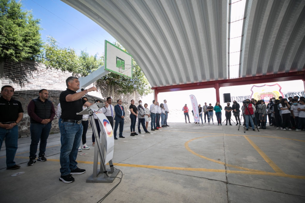 Por otra parte, el director de Obras Públicas, Germán Reyes Retureta, informó que los arcotechos están cimentados con material de alta calidad, así como trabes y columnas metálicas. La techumbre entregada en la secundaria, institución con casi cinco décadas de servicio, es el más grande que se ha construido en esta administración, ya que tiene una extensión de 386 metros cuadrados en beneficio de 850 alumnos y docentes, mientras que la de la escuela “Ahuízotl” mide 240 m2 en beneficio de 150 estudiantes y profesores.