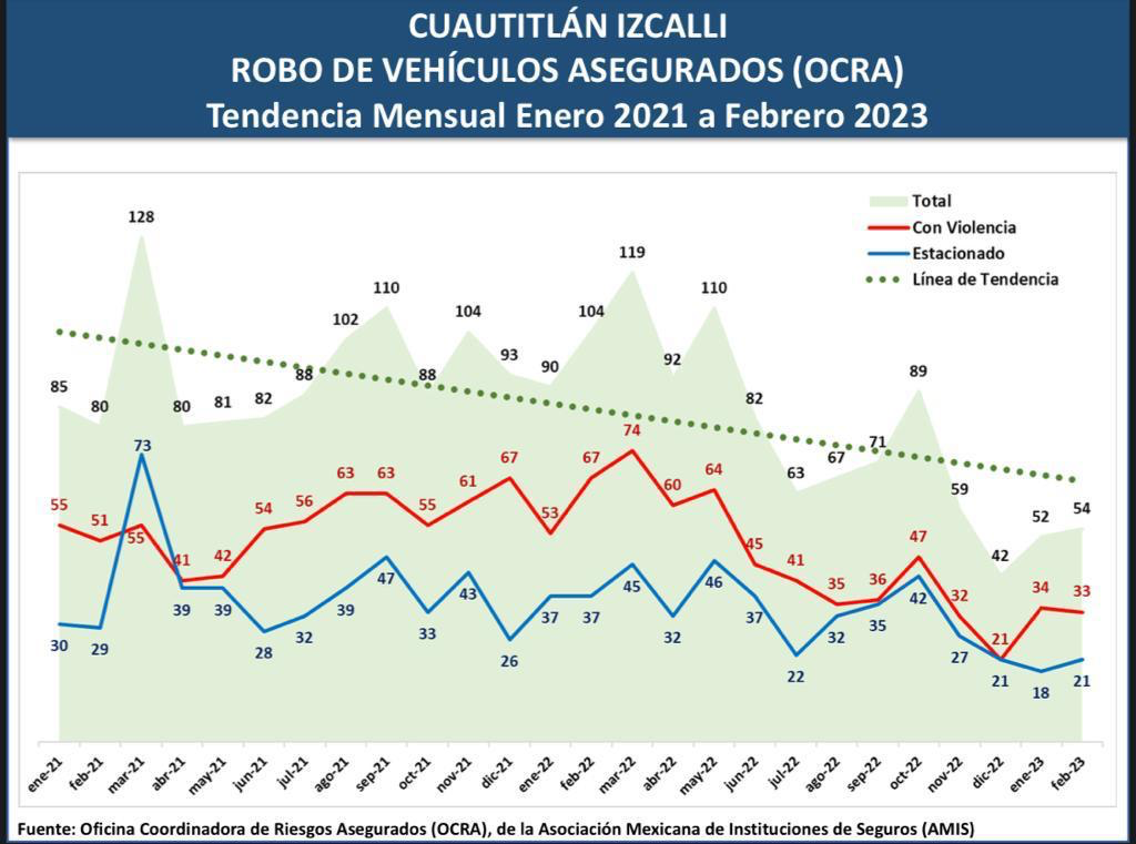Con estas acciones y con datos de la OCRA, Cuautitlán Izcalli pasó del 4° lugar al 17° en el robo de vehículos asegurados durante enero y febrero de 2023 en donde se registraron 106 casos en comparación con los 194 registrados durante el inicio del Gobierno Municipal que preside Karla Fiesco García.