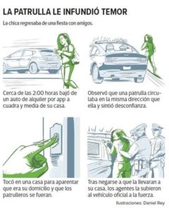 La víctima relató ante el Ministerio Público que después de acudir a una fiesta, un amigo que iba a usar un auto de alquiler por aplicación ofreció dejarla cerca de su casa. Bajó a dos cuadras de su domicilio, pero en el trayecto a pie, ya sola, fue sorprendida por los agentes.