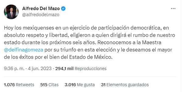 El gobernador Alfredo Del Mazo Maza también se pronunció a través de su cuenta de Twitter, donde felicitó a la maestra Delfina por su victoria en la elección. Este gesto demuestra la madurez política y el respeto hacia la voluntad ciudadana expresada en las urnas.