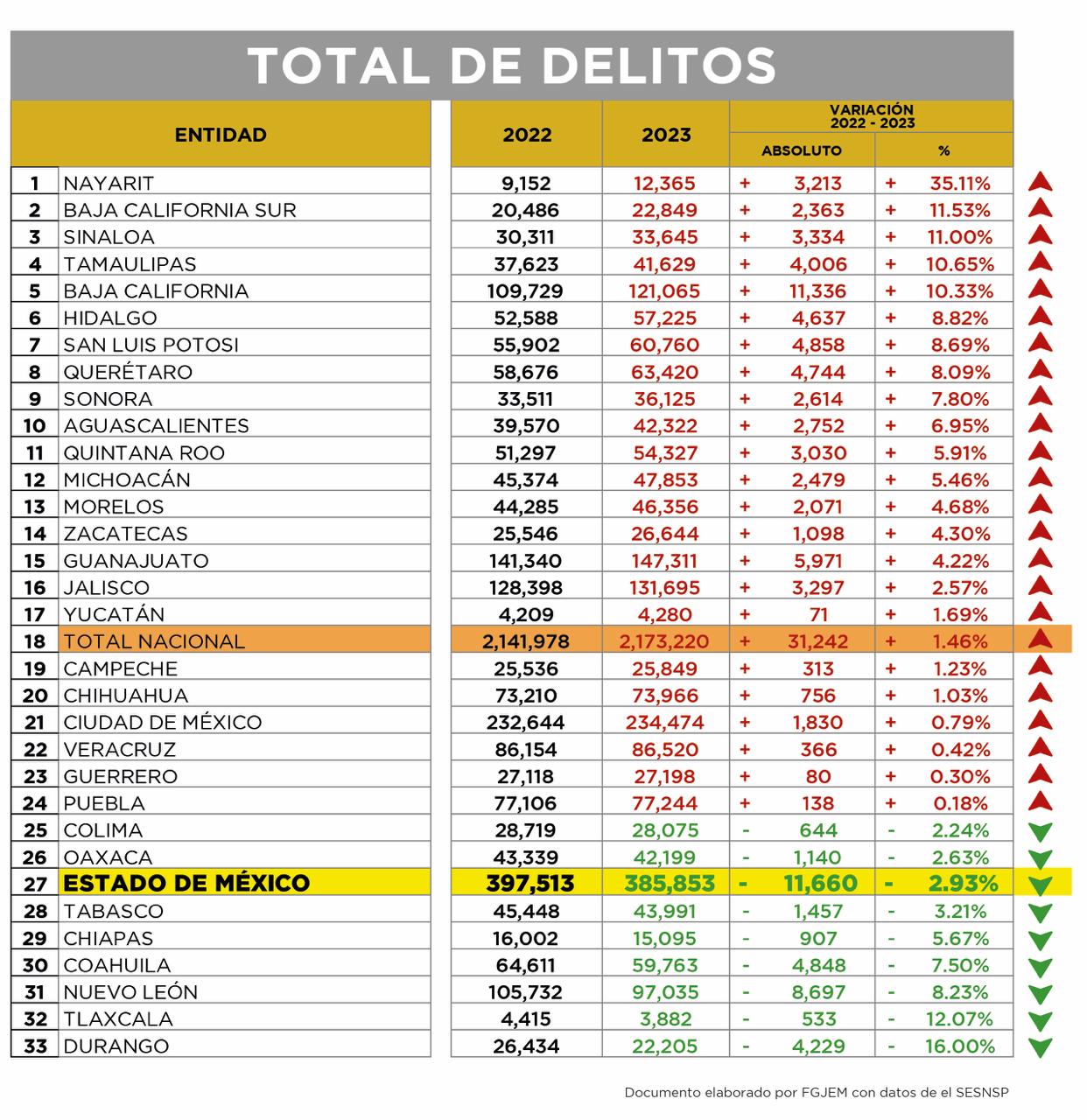 A nivel nacional, el homicidio doloso registra un decremento del 3.84 por ciento al pasar de 26,279 homicidios en 2022 a 25,271 en 2023. Entidades circunvecinas como Morelos, Guerrero, Ciudad de México y Querétaro registran incremento en este delito.