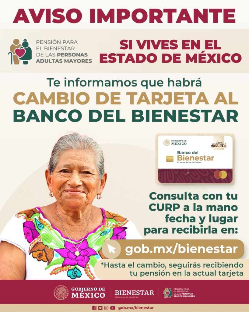 - La secretaria de Bienestar, Ariadna Montiel Reyes, y el coordinador general de Programas para el Desarrollo, Carlos Torres Rosas, anunciaron el inicio del cambio paulatino de la tarjeta al Banco del Bienestar para 700 mil derechohabientes de Pensiones para el Bienestar de las Personas Adultas Mayores y de las Personas con Discapacidad, entre el 22 de noviembre del presente año y el 31 de marzo de 2023. Las y los derechohabientes podrán ubicar el lugar y fecha para recoger su tarjeta a través de la página oficial: gob.mx/bienestar, informó Ariadna Montiel en conferencia de prensa celebrada este lunes en Naucalpan. Garantizó que, hasta el cambio, las personas seguirán recibiendo su pensión en la actual tarjeta.