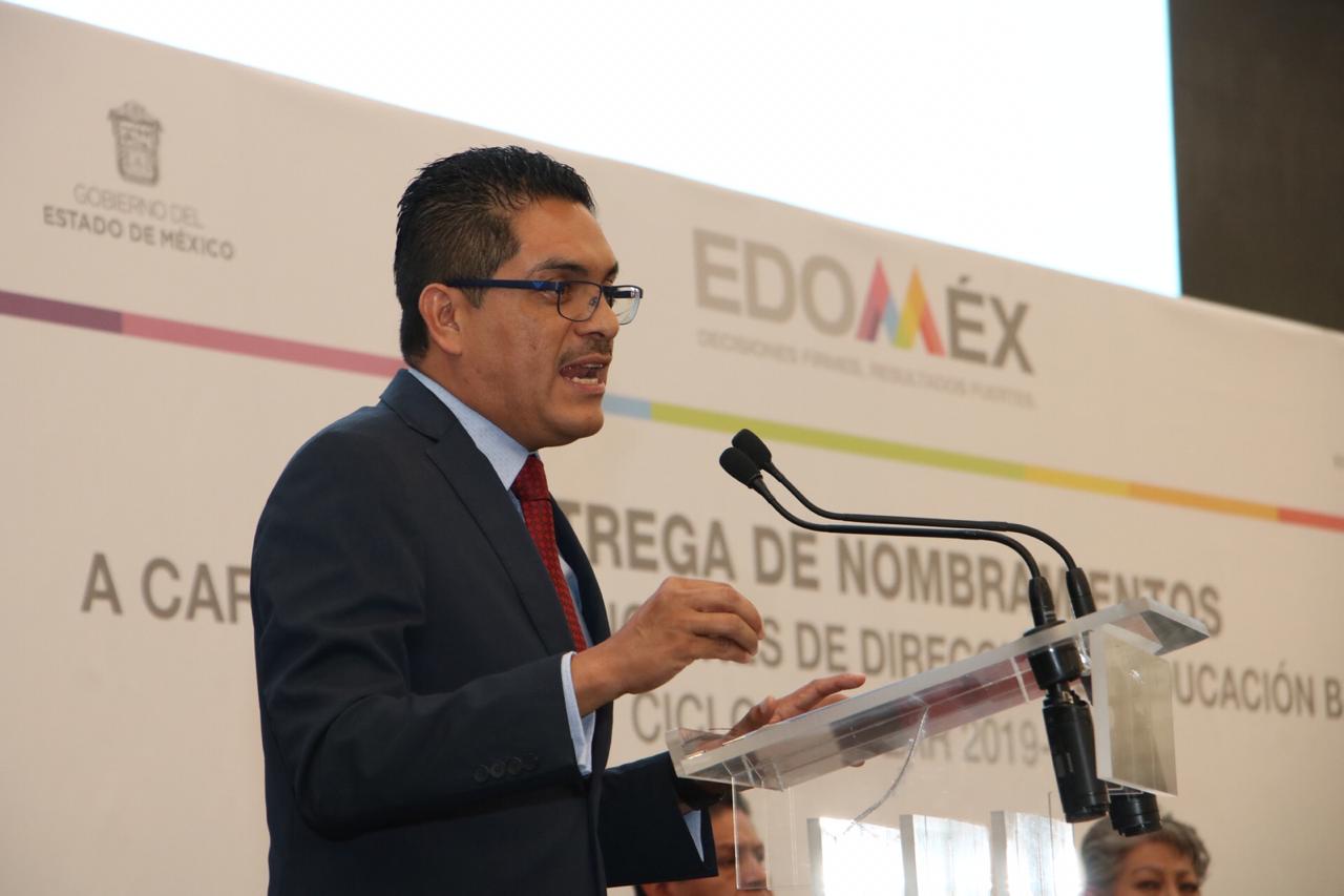 Al acompañar a Rogelio Tinoco García, Subsecretario de Educación Básica a la entrega nombramientos por tiempo fijo a cargos con funciones de Dirección en Educación Básica del Subsistema Educativo Estatal, Ciclo Escolar 2019-2020, el líder del SMSEM resaltó la importancia de privilegiar el reconocimiento de la comunidad educativa, los padres de familia y los alumnos hacia los profesores a través del Escalafón.