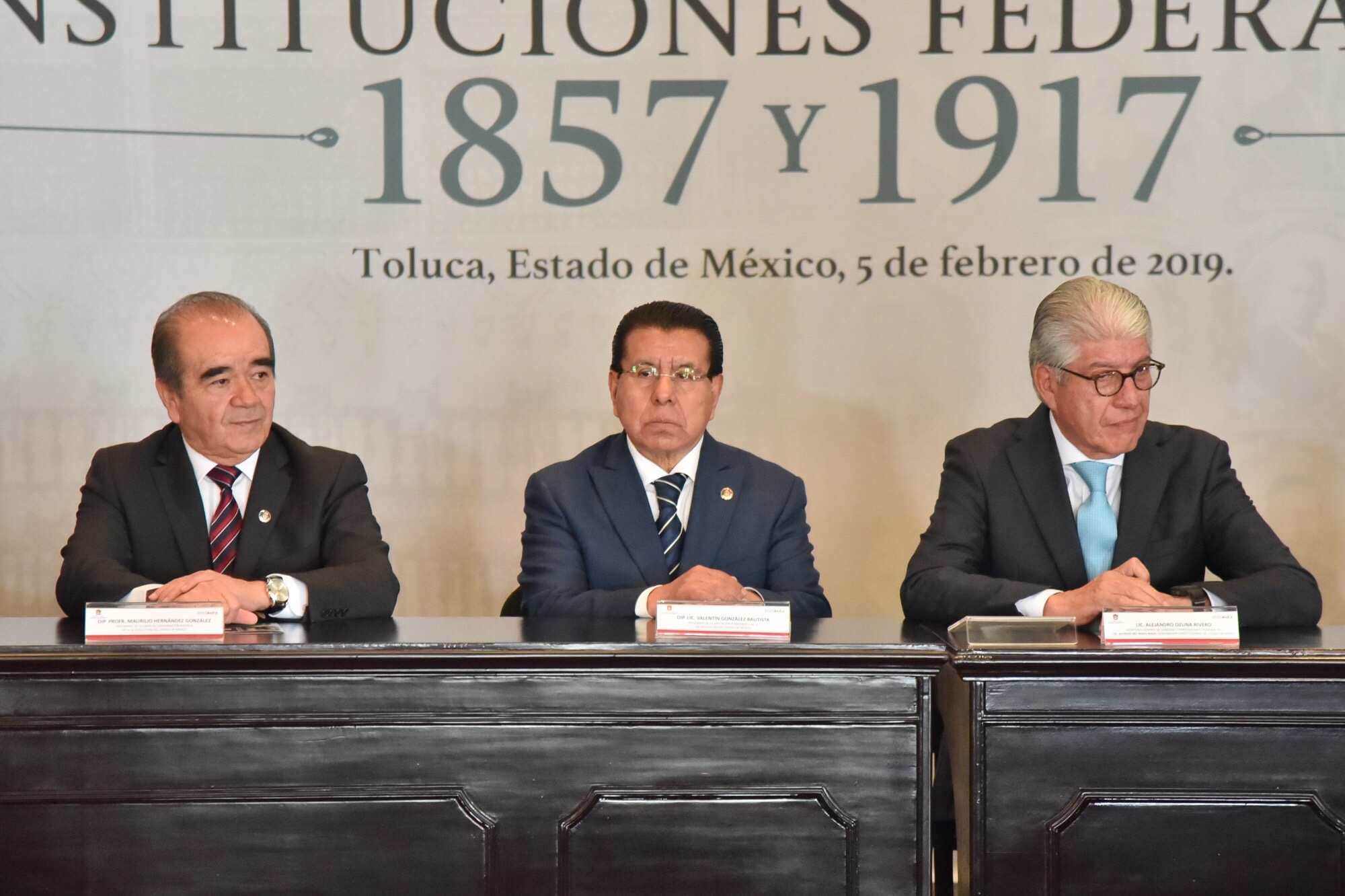 Toluca, México, 5 de febrero de 2019.- Los diputados Maurilio Hernández González y Valentín González Bautista, presidentes de la Junta de Coordinación Política y de la Diputación Permanente de la 60 Legislatura, respectivamente, acudieron con el secretario general de Gobierno, Alejandro Ozuna Rivero, a la ceremonia conmemorativa de los aniversarios 162 y 102 de las Constituciones Federales de 1857 y 1917.
