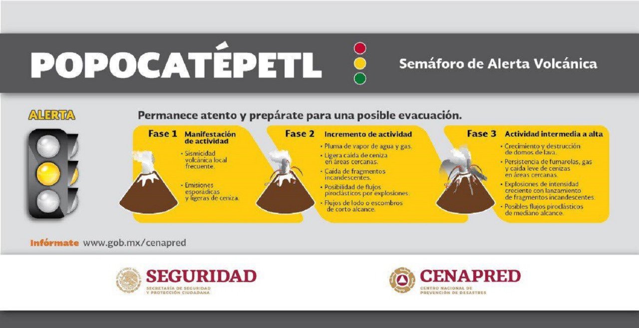 Si bien el Comité Científico Asesor del volcán recomendó cambiar la fase del Semáforo de Alerta Volcánica de Amarillo Fase 2 a Amarillo Fase 3 –lo cual según datos del Centro Nacional de Prevención de Desastres (Cenapred) constituye una medida preventiva ante los cambios observados–, el funcionario estatal puntualizó que el 95 por ciento de este alertamiento va dirigido a las acciones que deben emprender las autoridades estatales, municipales y federales, como es el caso de que sus respectivos planes operativos coincidan y fortalecer los mecanismos de comunicación hacia la población.