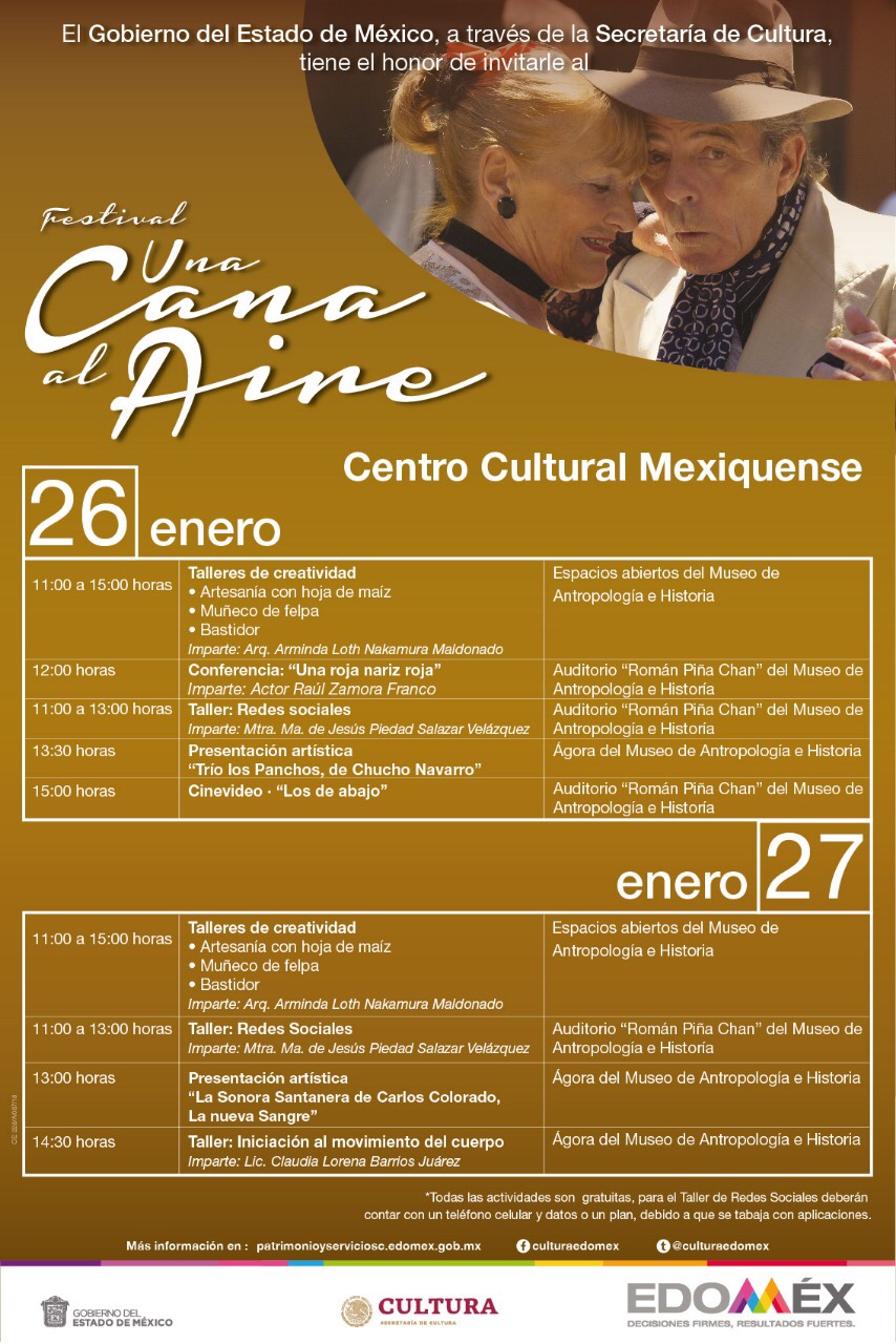 Toluca, Estado de México, 23 de enero de 2019. Para ofrecer actividades artísticas y culturales para todo tipo de público, el Gobierno del Estado de México, a través de la Secretaría de Cultura, llevará a cabo una jornada del programa “Una cana al aire”, diseñado con actividades enfocadas para personas mayores, las cuales se ofrecen de manera gratuita.