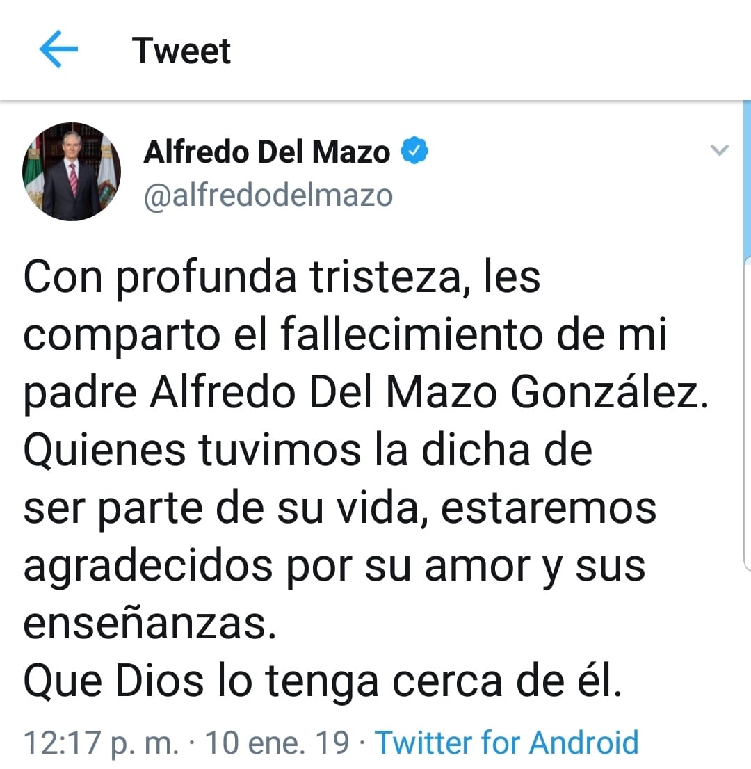 “Con profunda tristeza les comparto el fallecimiento de mi padre Alfredo Del Mazo González.