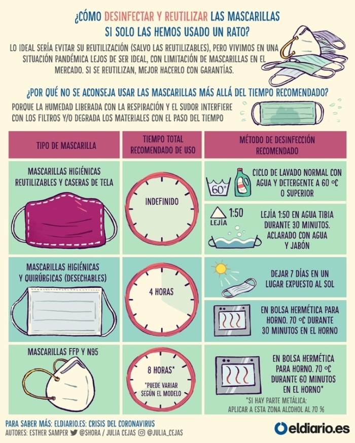 Hasta esta pandemia, eran casi exclusivamente los profesionales sanitarios los que usaban mascarillas y las utilizaban por unas horas para posteriormente desecharlas. Sin embargo, ahora la situación es muy diferente y multitud de personas se preguntan cuánto es el tiempo máximo recomendable de uso de las mascarillas o qué medidas de desinfección son las aconsejables para reutilizarlas.