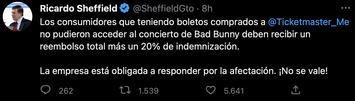Por último Ricardo Sheffield, titular de PROFECO, mencionó que los afectados por Ticketmaster en el concierto de Bad Bunny, deberán recibir un reembolso total más un 20% de indemnización.