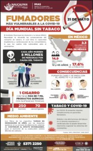 En el Día Mundial sin Tabaco, el Instituto Municipal de Atención a la Salud (IMAS) de Naucalpan recordó las consecuencias del consumo de tabaco, el cual mina la capacidad respiratoria y cardiovascular, algo que vuelve más vulnerables a las personas ante el coronavirus.