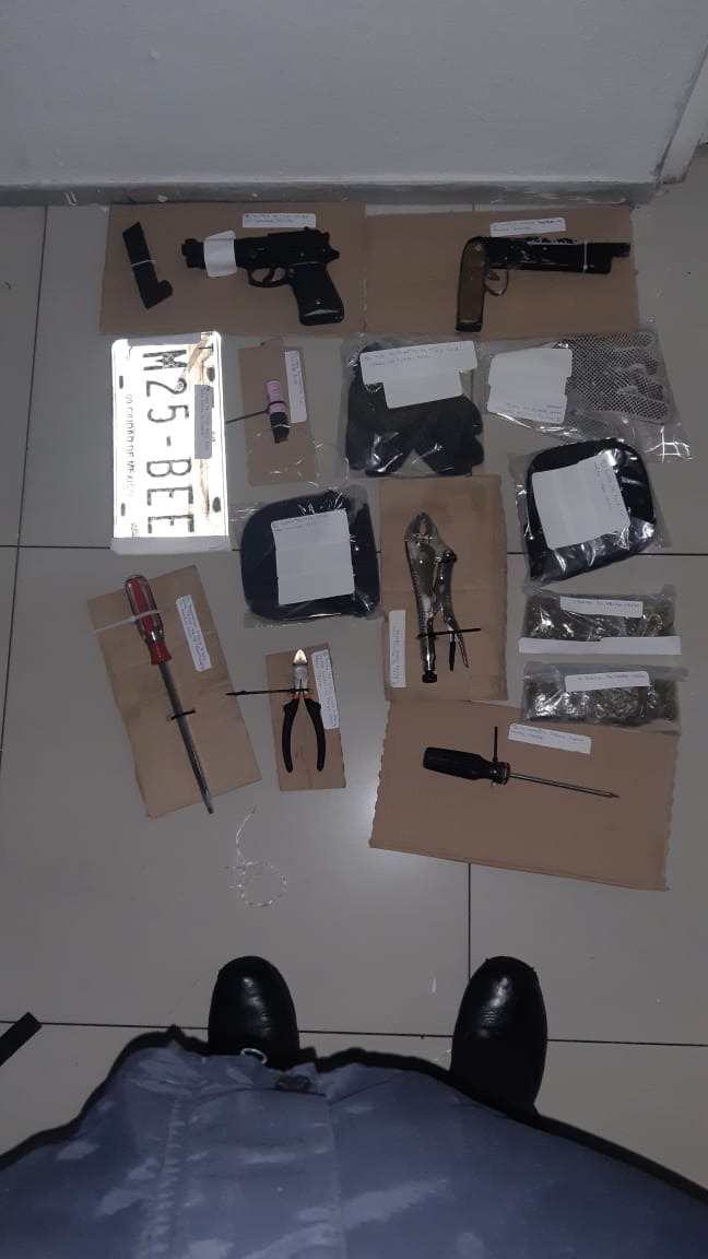 Los agentes realizaron una inspección del vehículo y encontraron dos armas cortas, guantes, desarmadores, pinzas de presión y de corte, así como un juego de placas vehiculares.