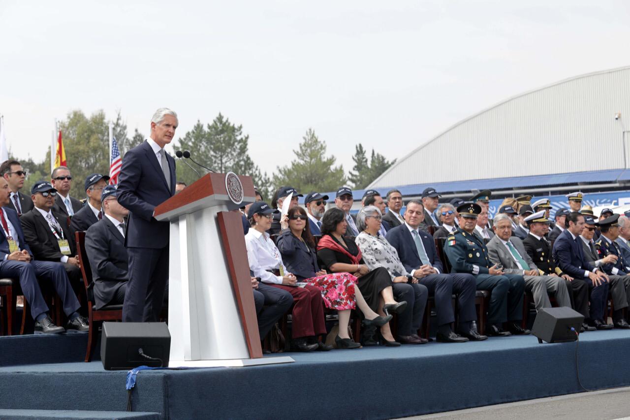 Ante el General Luis Cresencio Sandoval, Secretario de la Defensa Nacional, y del Almirante Rafael Ojeda Durán, Secretario de la Marina Armada de México, Alfredo Del Mazo indicó que actualmente se estima que para el año 2020, un total de 450 empresas de este sector requerirán mano de obra altamente calificada en el país, así como una infraestructura de clase mundial para instalarse, por lo que aseguró que el Estado de México cuenta con las condiciones apropiadas para desarrollar los proyectos de esta industria