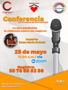 Anunció que en apoyo a las mujeres y en conmemoración del Día Naranja, el próximo 25 de mayo se llevará a cabo la conferencia digital «La otra pandemia, la violencia contra las mujeres», impartida por Rosa María Oviedo.