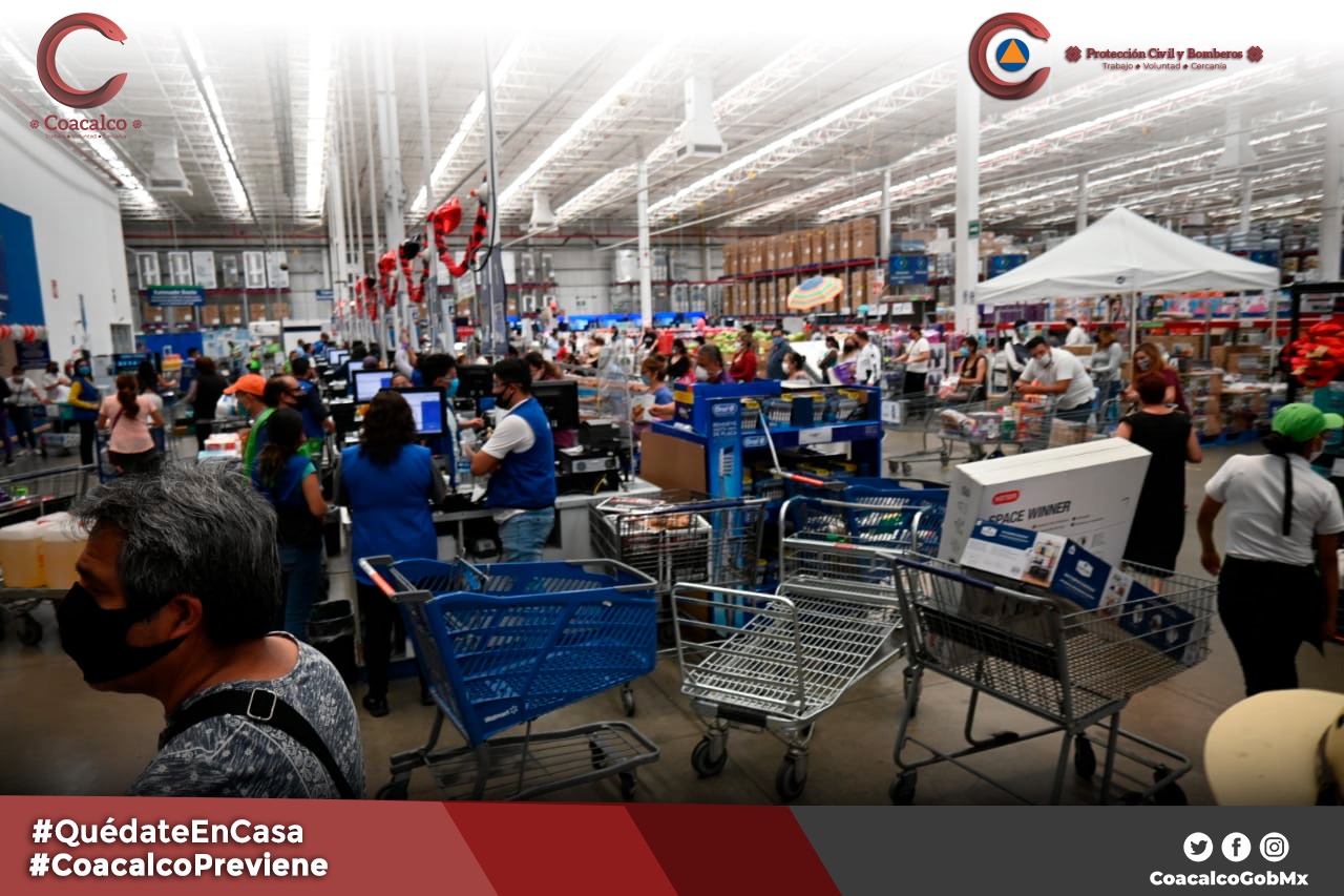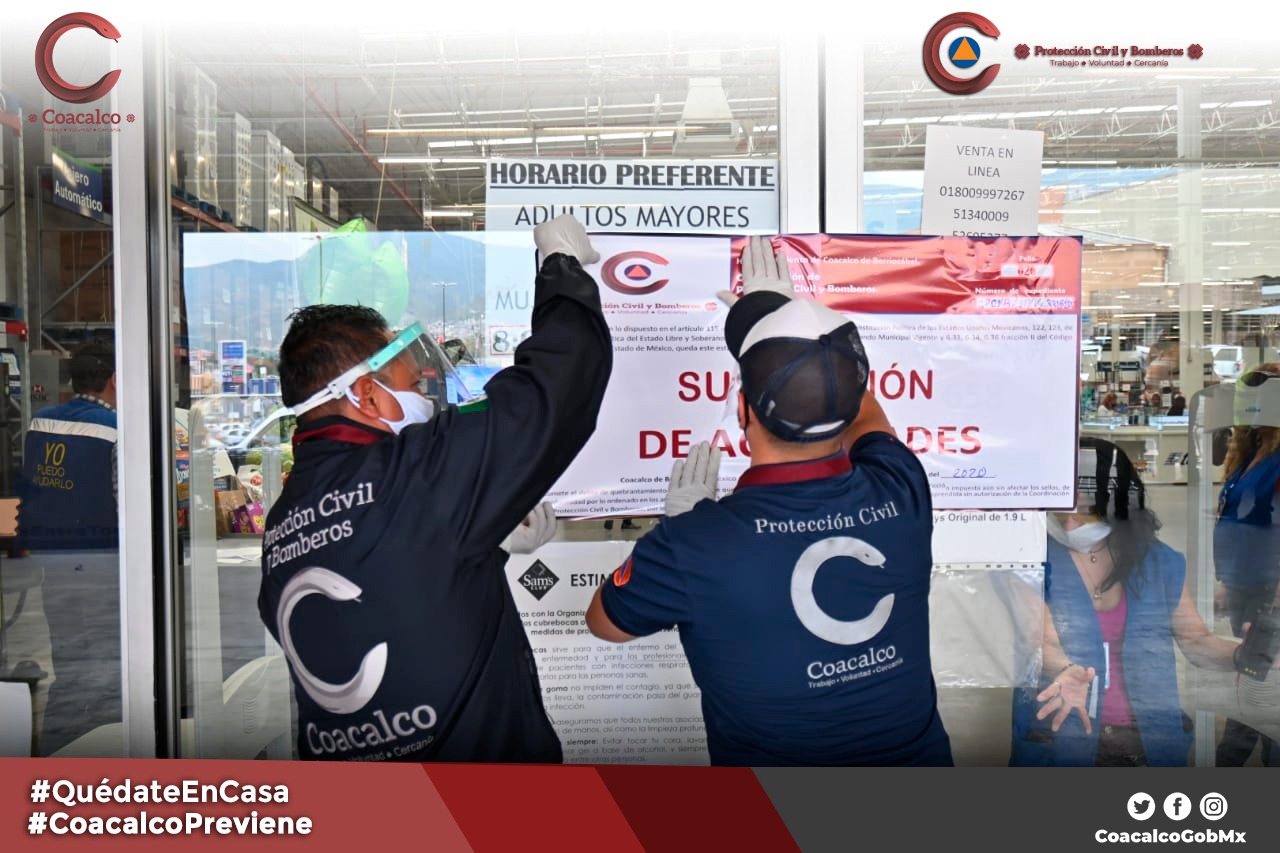 El Gobierno de Coacalco, a través de la Coordinación de Protección Civil y Bomberos municipal, colocó sellos de suspensión a la tienda de autoservicio Sam´s Club, ubicada en ubicada en la Vía José López Portillo No. 101, Villa de las Flores, porque el establecimiento incumplió con las reglas señaladas en la Jornada Nacional de Sana Distancia, impulsada por el Gobierno Federal y los lineamientos publicados en la gaceta de Gobierno del Estado de México, ante la contingencia de salud por el Covid-19.