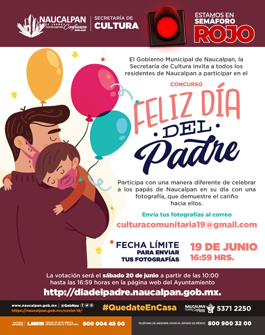 La Secretaría de Cultura municipal invitó a los naucalpenses a participar en el concurso «Feliz Día del Padre», con el que se busca incentivar la creatividad para festejar esta fecha sin desatender las medidas preventivas por la emergencia sanitaria por COVID-19.