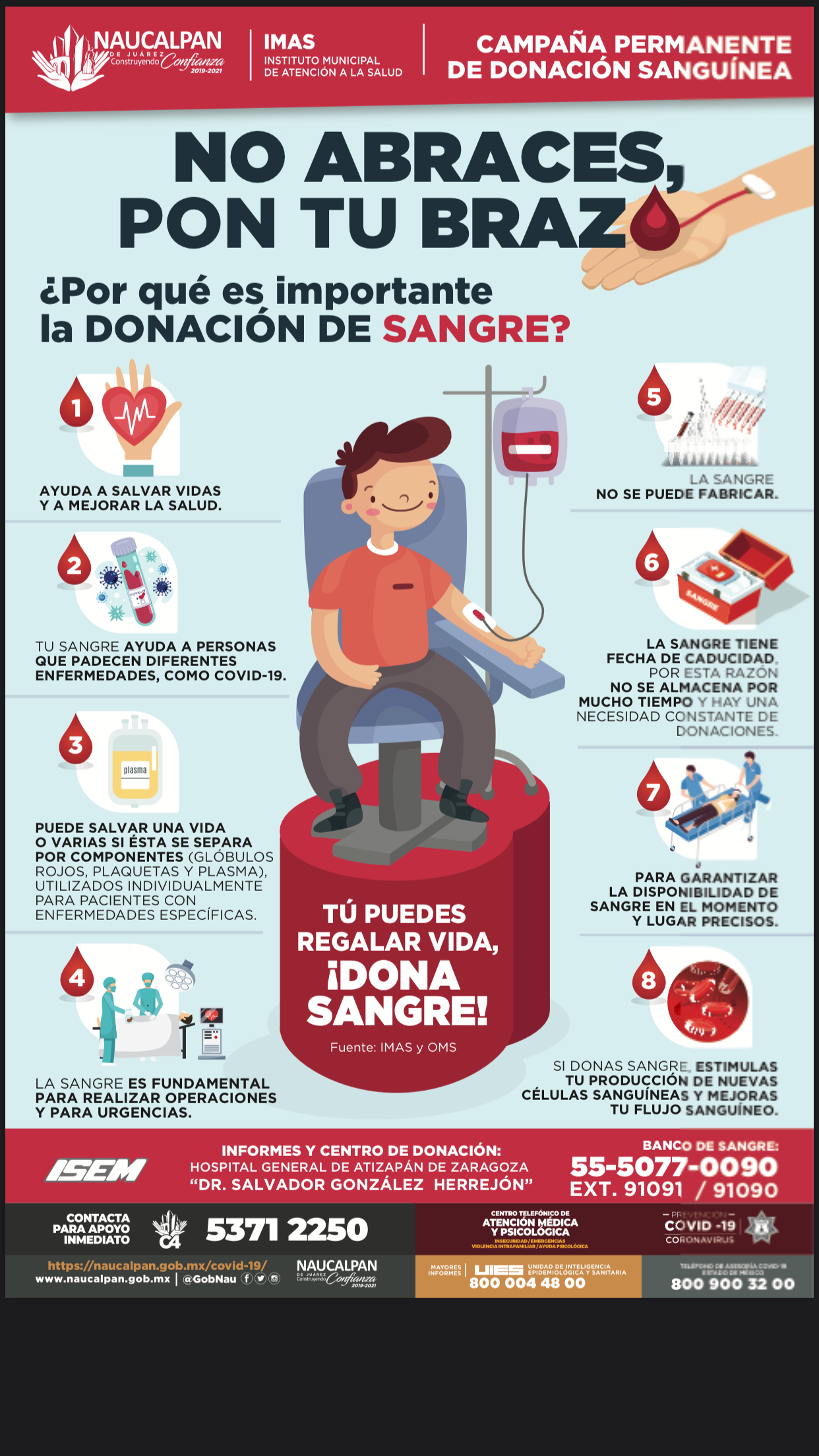El Gobierno de Naucalpan, a través del Instituto Municipal de Atención a la Salud (IMAS), invita a la ciudadanía a sumarse a la campaña de donación de sangre “No abraces, pon tu brazo”, en el marco del Día Mundial del Donante de Sangre, que se celebra hoy.