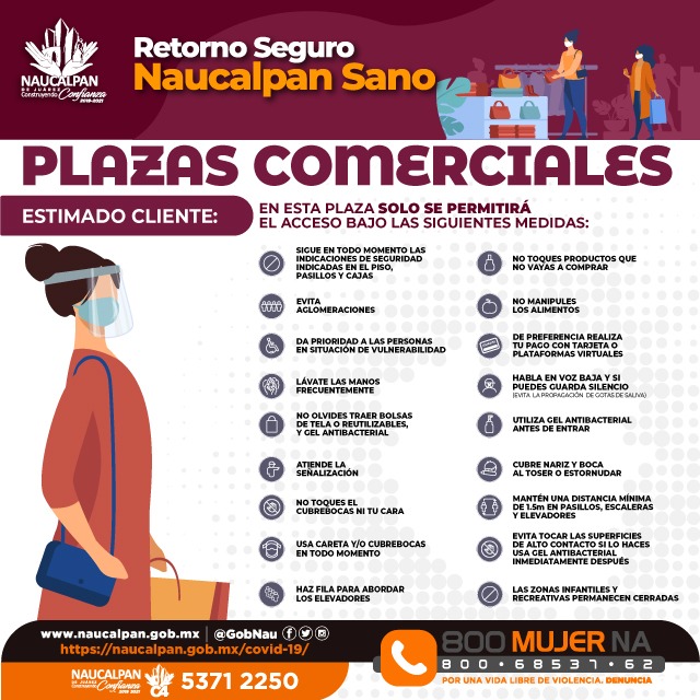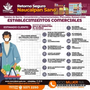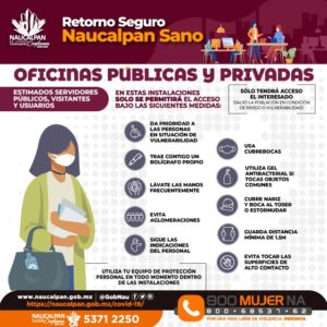 Para mitigar riesgos de contagio, la Administración naucalpense presentó el Plan de Regreso Seguro, con los lineamientos y protocolos para comercios, espacios públicos, oficinas, transporte público, entre otros, a las que se suman las recomendaciones sanitarias, como usar cubrebocas, utilizar gel antibacterial, desinfectar áreas comunes, lavado frecuente de manos y distancia de por lo menos metro y medio entre personas.