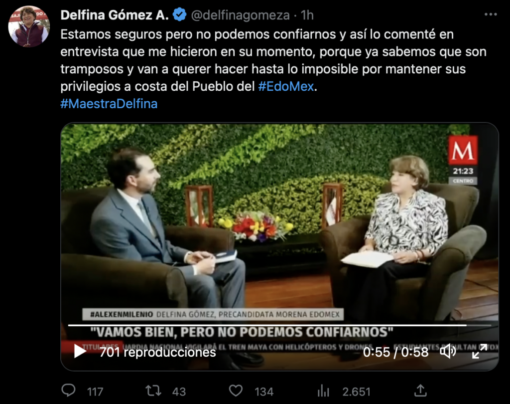 Durante una entrevista que realizó el medio de comunicación Milenio a Delfina Gómez, la precandidata a la gobernatura del Estado de México mencionó sentirse segura respecto a los números obtenidos en su precampaña , pero a pesar de salir ganadora en las estadísticas, recalcó en varias ocaciones que su partido no se puede confiar debido a las vivencias del 2017