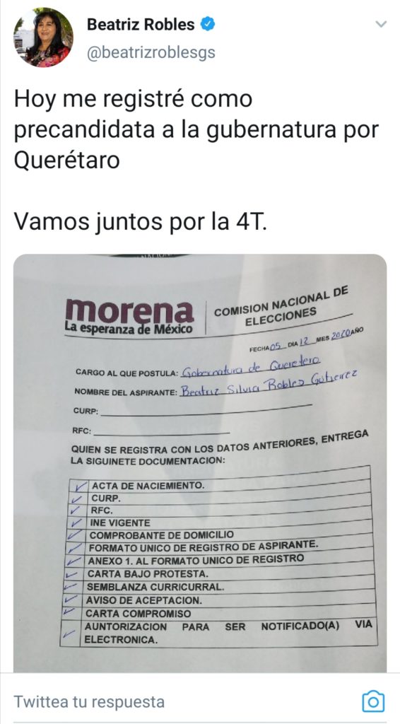 La Diputada Federal del partido de Andrés Manuel López Obrador, Beatriz Robles posteo mediante su cuenta de #twitter @beatrizroblesgs una imagen donde compartió su contrarecibo que le dan en su partido, MORENA, para inscribirse a un cargo de elección popular para el próximo año.