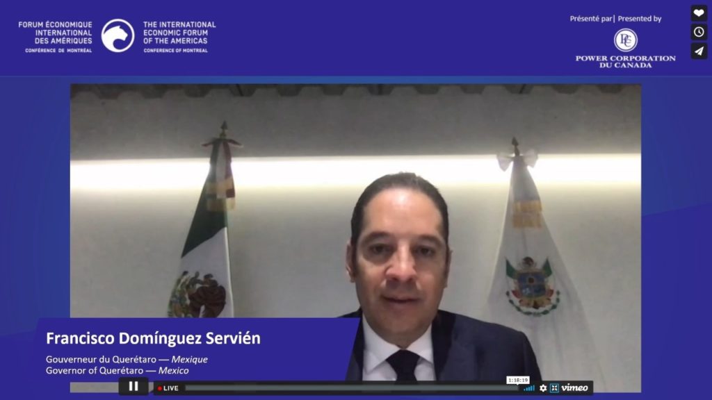 Francisco Domínguez Servien, Gobernado de Querétaro: menciono “En Querétaro hay condiciones de certeza para los inversionistas”, durante su participación en la vigésimo sexta edición de la Conferencia de Montreal 2020, que celebra en formato virtual el Foro Económico Internacional de las Américas.