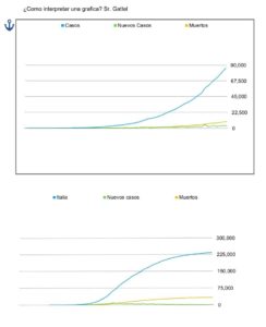 La primera es la gráfica de México, donde según ya se esta aplanando la curva, la segunda es Italia, efectivamente aplanando los contagios y muertes, apenas relajando e iniciando actividades.