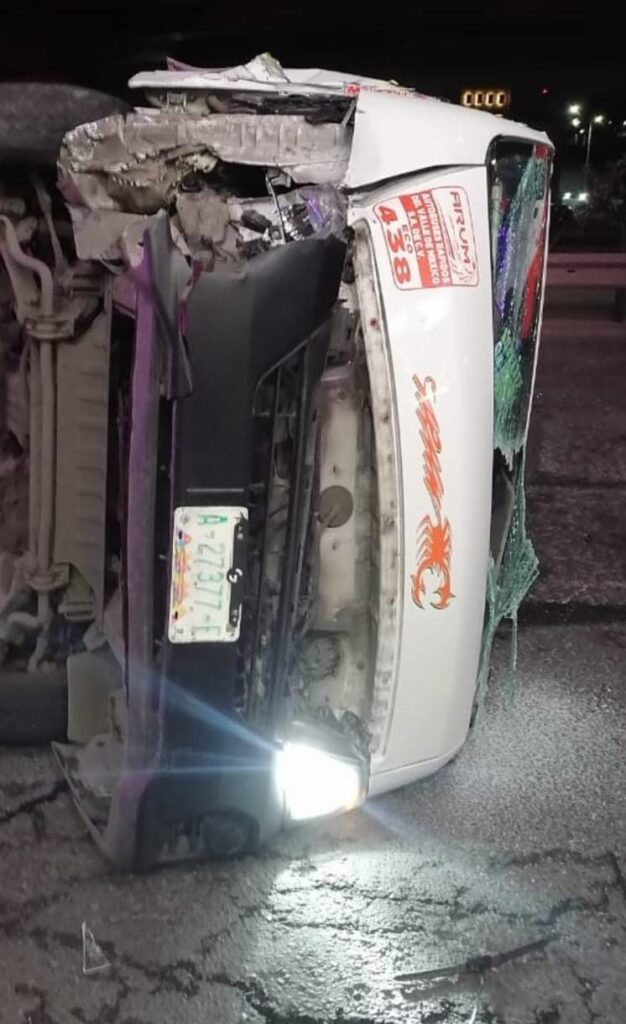 Esta madrugada personal de Protección Civil y de la Dirección de Seguridad Pública Municipal, atendieron la volcadura de una unidad de transporte público, en la que resultaron 9 personas lesionadas entre ellas el conductor.