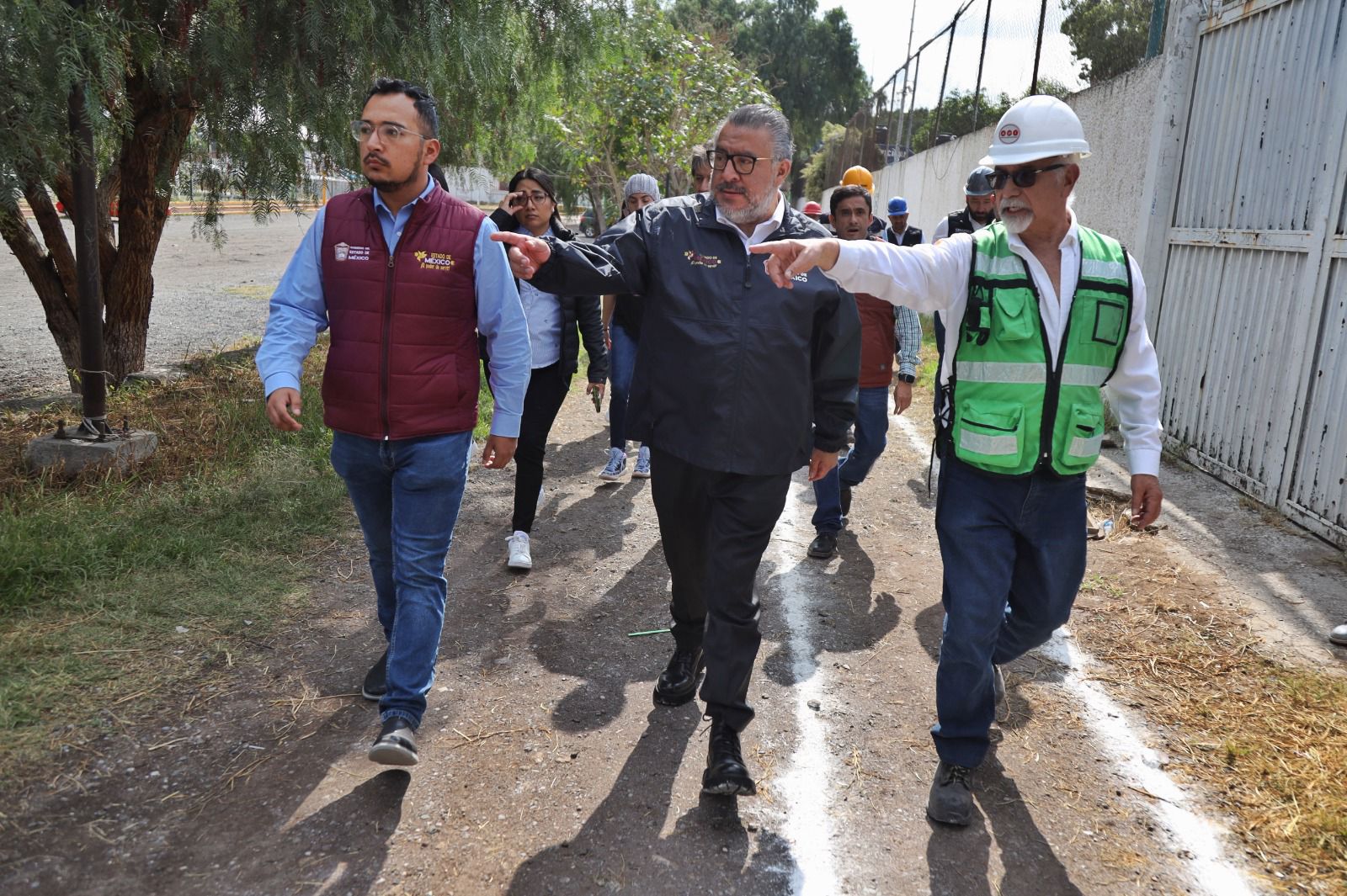 En este recorrido, el Maestro Horacio Duarte Olivares estuvo acompañado por Alejandro Viedma Velázquez, Subsecretario General de Gobierno del Estado de México; por Adrián Hernández Romero, Director General de Protección Civil, y por el Ingeniero René Ortiz, de la Comisión Nacional de Vivienda.