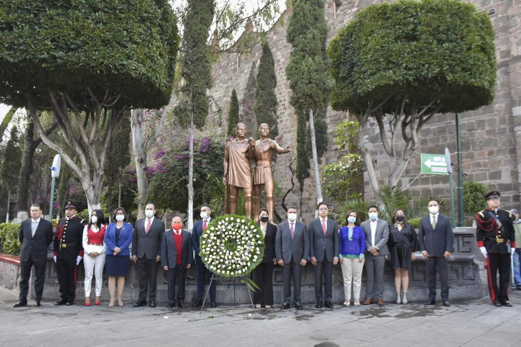 Acompañado por su esposa, la Presidenta Honoraria del Sistema Municipal DIF, María Gómez Martínez; el Secretario Técnico de la Región XIX y representante del Gobierno del Estado de México, Alejandro Abad Lara Terrón, así como integrantes del Cuerpo Edilicio, el Alcalde montó guardia de honor frente al monumento erigido por la fundación y las culturas de Tlalnepantla.