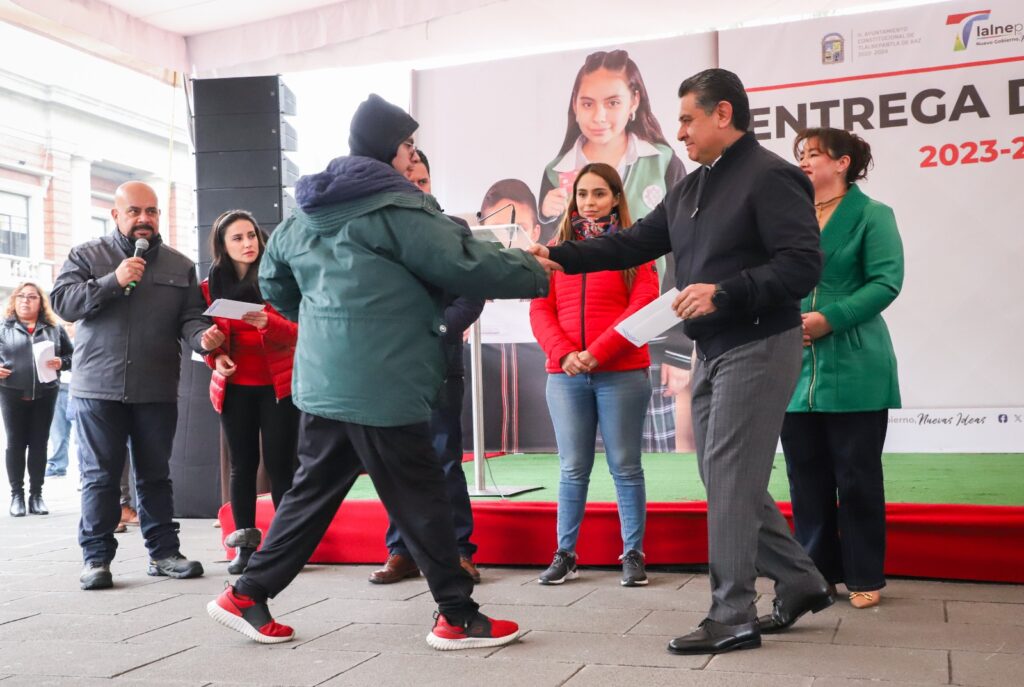 Tlalnepantla de Baz, Estado de México, a 14 de diciembre de 2023.– El Presidente Marco Antonio Rodríguez Hurtado, en eventos simultáneos en diferentes puntos, vía remota, desde la explanada Municipal hizo la entrega de las tarjetas del programa «Becas Municipales” a las y los beneficiarios, acto al que acudieron las mamás, papás o tutores de los 10 mil estudiantes favorecidos con dicho programa.