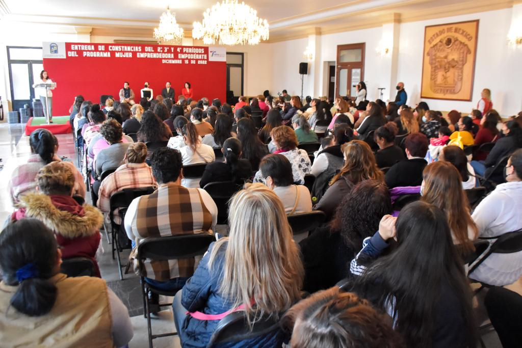 Previamente en el Salón del Pueblo, se entregaron constancias a las tlalnepantlenses que se capacitaron como parte del programa «Mujer Emprendedora», correspondientes a los periodos segundo, tercero y cuarto, luego de tomar cursos de serigrafía, pastelería, uñas, entre otros, para así contribuir a que las tlalnepantlenses sean autosuficientes.