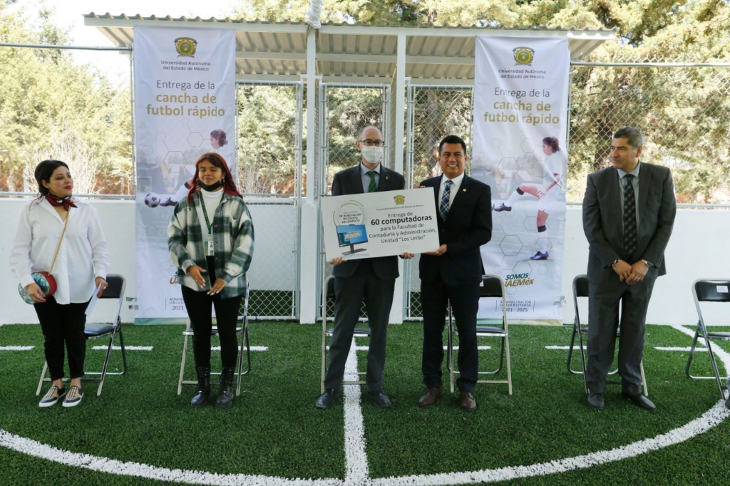 • El rector de la UAEMéx, Carlos Eduardo Barrera Díaz, entregó en la Unidad “Los Uribe”, 60 equipos de cómputo, una cancha de fútbol rápido y rehabilitación de infraestructura académica.