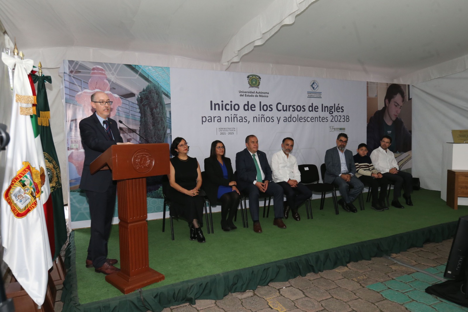 El inglés es un vehículo fantástico que permite estimular la curiosidad para explorar culturas diferentes, acceder a conocimientos de todos los continentes y comunicarse con personas de todos los rincones del planeta, expresó el rector de la Universidad Autónoma del Estado de México (UAEMéx), Carlos Eduardo Barrera Díaz al inaugurar los Cursos de Inglés para Niñas, Niños y Adolescentes 2023 B.