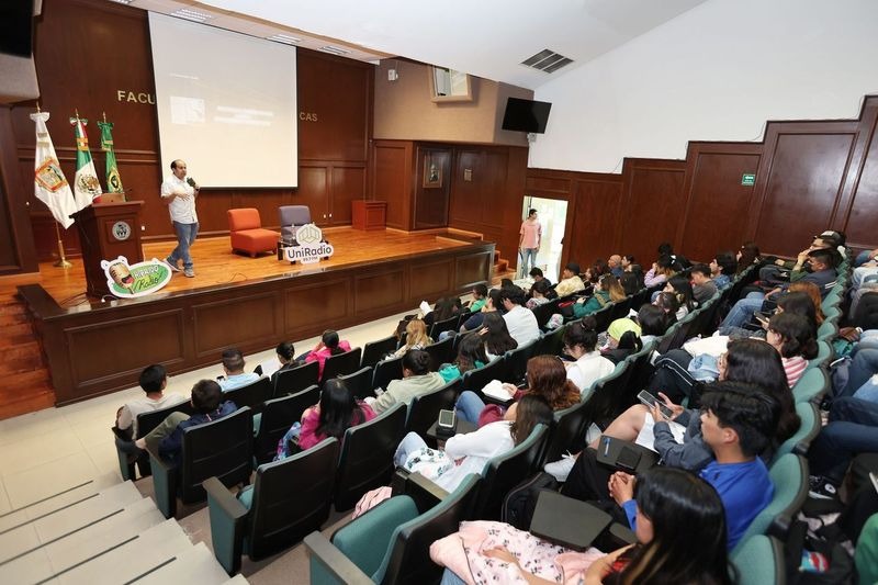 Toluca, Méx; 29 de diciembre de 2023. “La radio y el podcast son espacios para hacer convergencia y seguir experimentando libres de prejuicios”, destacó Guillermo Hernández Servín, Licenciado en Comunicación de la Universidad Autónoma Metropolitana (UAM), quien ofreció la conferencia “¿Qué escucho?/ Podcast vs. Radio”, en el Auditorio “Ignacio Ramírez Calzada” de la Facultad de Ciencias Políticas y Sociales de la Universidad Autónoma del Estado de México (UAEMéx).