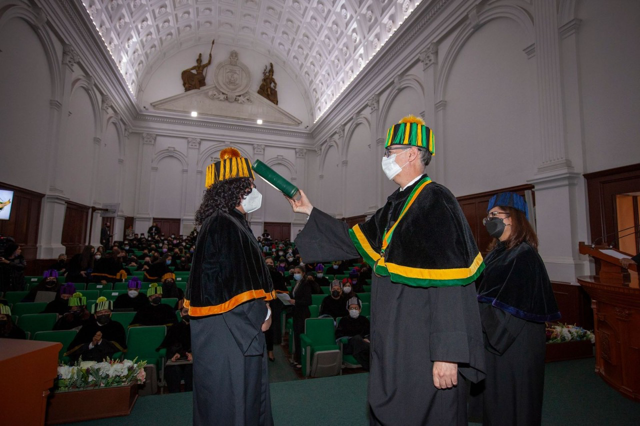 En el Aula Magna “Lic. Adolfo López Mateos” del Edificio de Rectoría, Barrera Díaz acompañado de la secretaria de Investigación y Estudios Avanzados, Martha Patricia Zarza Delgado, entregó 47 grados de maestría y 44 grados doctorado.