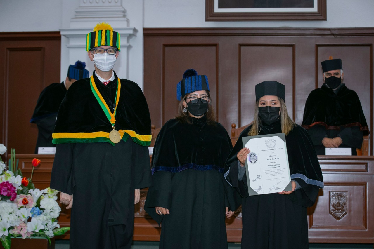 En la Ceremonia de Entrega de Grado Maestría y Doctorado estuvieron presentes la graduada de doctorado con mejor promedio Mireya Sánchez Aceves, integrantes del Gabinete Universitario, Colegio de Directores y comunidad universitaria en general.