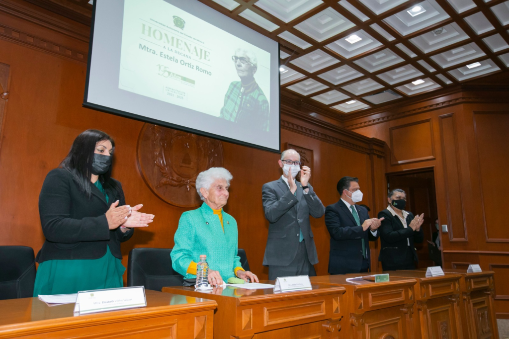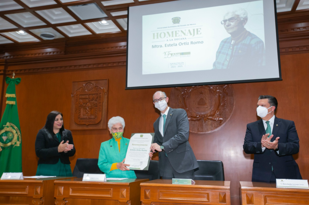 Por sus invaluables aportaciones académicas y laborales a lo largo de 87 años de vida, 67 como institutense-universitaria, 29 como integrante del Colegio de Cronistas y nueve como decana universitaria, Estela Ortíz Romo fue homenajeada por la comunidad de la Universidad Autónoma del Estado de México (UAEMéx), acto que presidió el rector de esta casa de estudios, Carlos Eduardo Barrera Díaz.