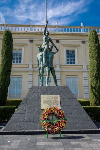 •En la Plaza de la Autonomía, el rector de la UAEMéx, Carlos Eduardo Barrera Díaz, encabezó una guardia de honor y colocó una ofrenda floral en el monumento “Tocando el Sol”, símbolo que representa la obtención de la Autonomía Universitaria.