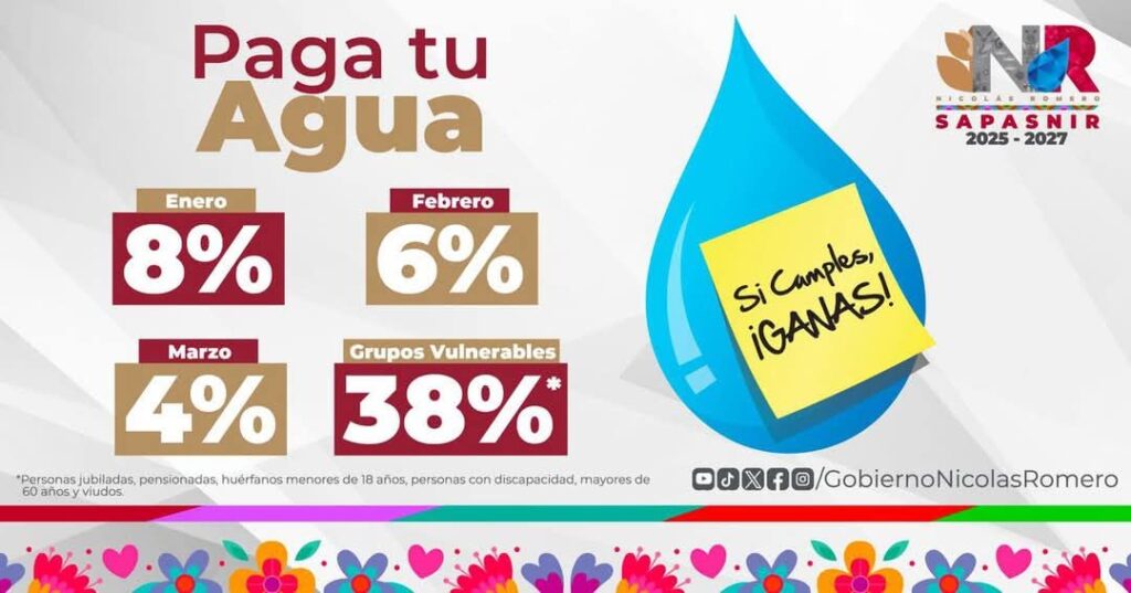 El gobierno de Nicolás Romero invita a la ciudadanía a beneficiarse de las promociones vigentes en el pago del servicio de agua. ✅ Cumplir con tus contribuciones no solo te brinda descuentos, sino que también ayuda a fortalecer la infraestructura hidráulica del municipio.