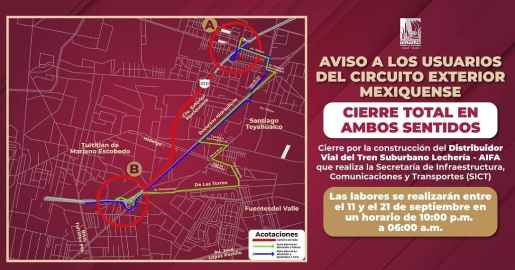Como parte de los trabajos de ampliación del Tren Suburbano para conectarlo con el Aeropuerto Internacional Felipe Ángeles (AIFA), se ha anunciado un cierre total en el Circuito Exterior Mexiquense (CEM) debido a la construcción del Distribuidor Vial.