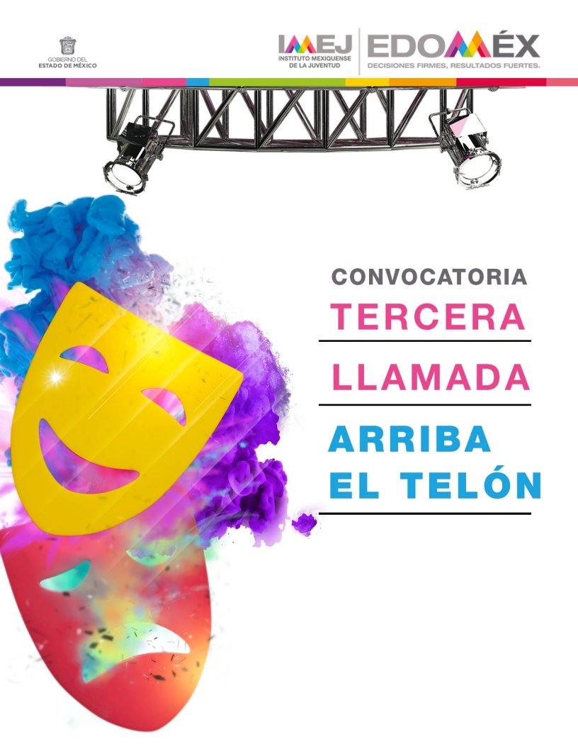 *Ecatepec, Estado de México, 27 de septiembre de 2019.* Con la finalidad de impulsar el teatro como una actividad artística que potencie la expresividad de las y los jóvenes mexiquenses, para establecer un diálogo con la juventud acerca de temas de su interés, el Instituto Mexiquense de la Juventud (IMEJ), invita a participar en el Concurso Juvenil de Teatro “Tercera Llamada Arriba el Telón”.