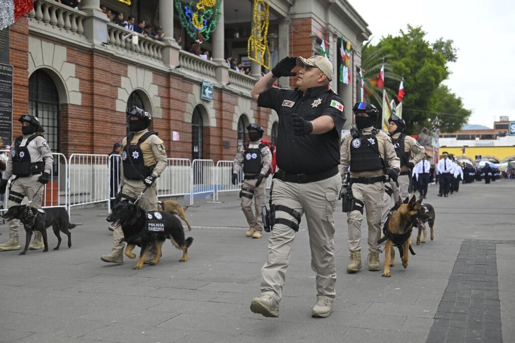 Durante el recorrido, alumnas y alumnos de 20 escuelas del municipio marcharon con entusiasmo, acompañados por los aplausos de sus familias. También participaron contingentes de la Comisaría General de Proximidad y Seguridad Ciudadana, Cruz Roja Mexicana, Pentatlón Universitario, Grupo de Intervención y Proximidad, Binomios K9, Tránsito y Vialidad, así como agrupamientos motorizados.