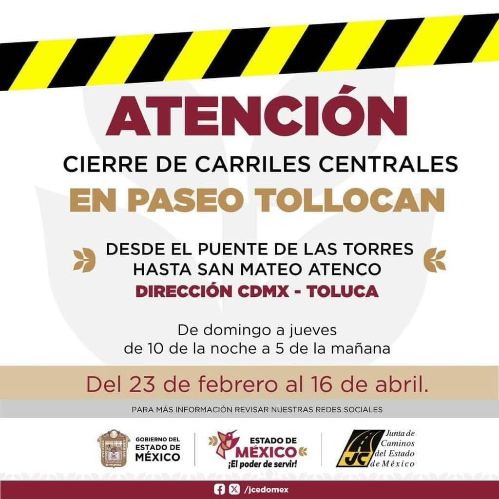 Carriles centrales de Av. Paseo Tollocan 3015 desde San Mateo Atenco a las Torres Bicentenario en dirección (CDMX-Toluca) del 23 de febrero al 16 de abril.