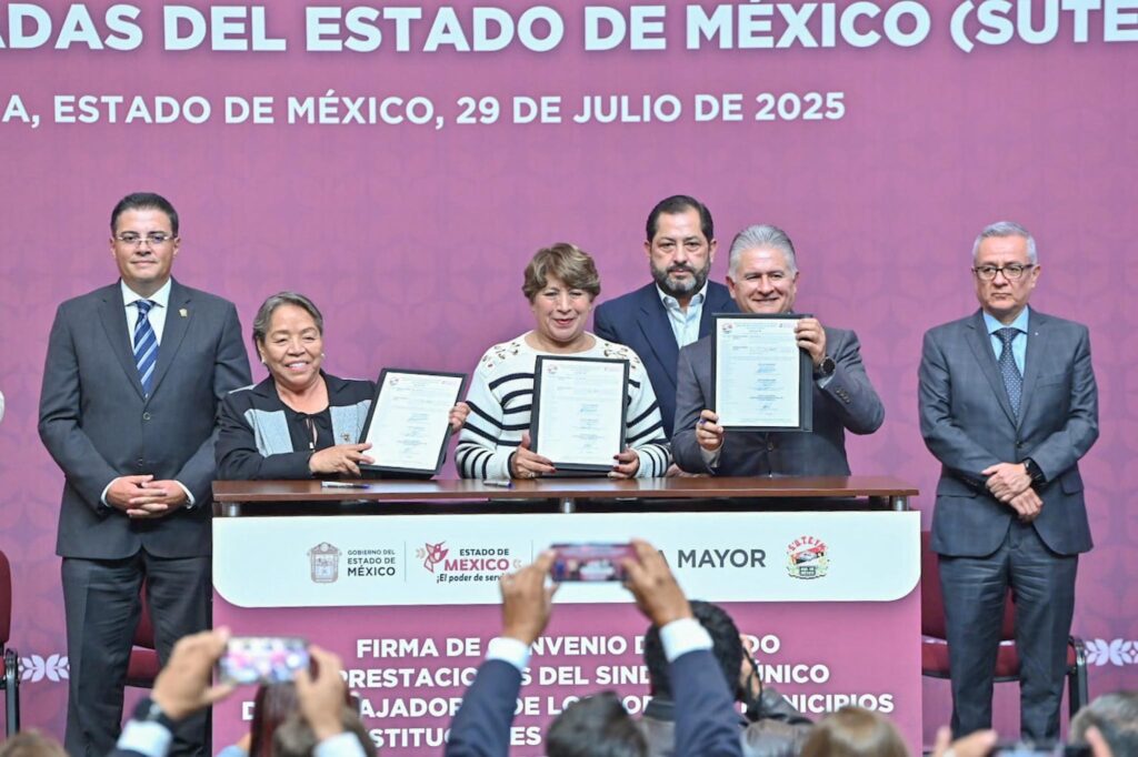 El acuerdo fue signado por la gobernadora Delfina Gómez Álvarez; el secretario general del SUTEyM, Herminio Cahue Calderón, y la titular de la Oficialía Mayor, Trinidad Franco Arpero.