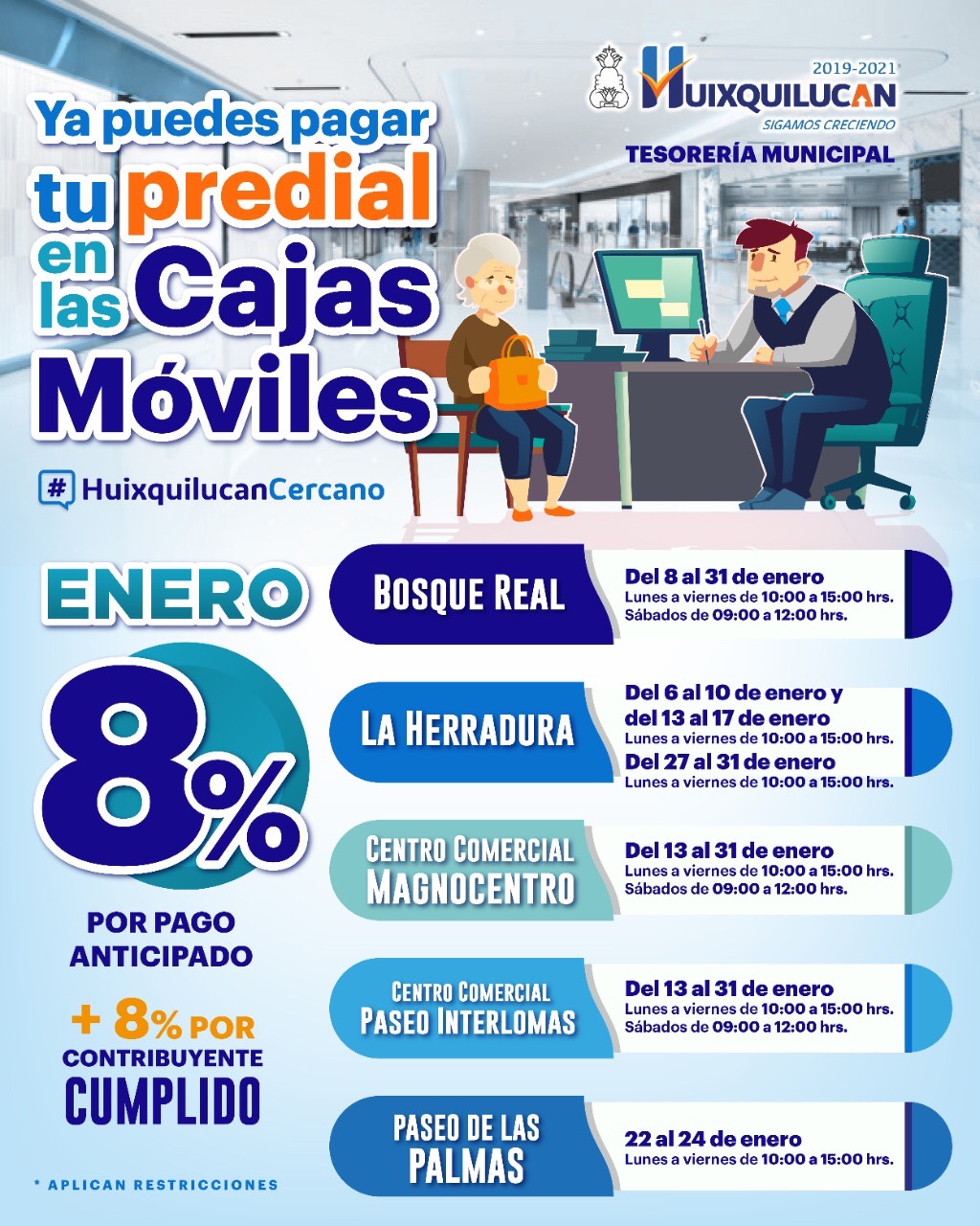 A partir del 13 de enero y hasta el último día del mes, en el Centro Comercial Magnocentro y en Paseo Interlomas, de lunes a viernes de las 10:00 a 15:00 horas y los sábados de 9:00 a 12:00 horas, la caja móvil estará dando atención a los contribuyentes.