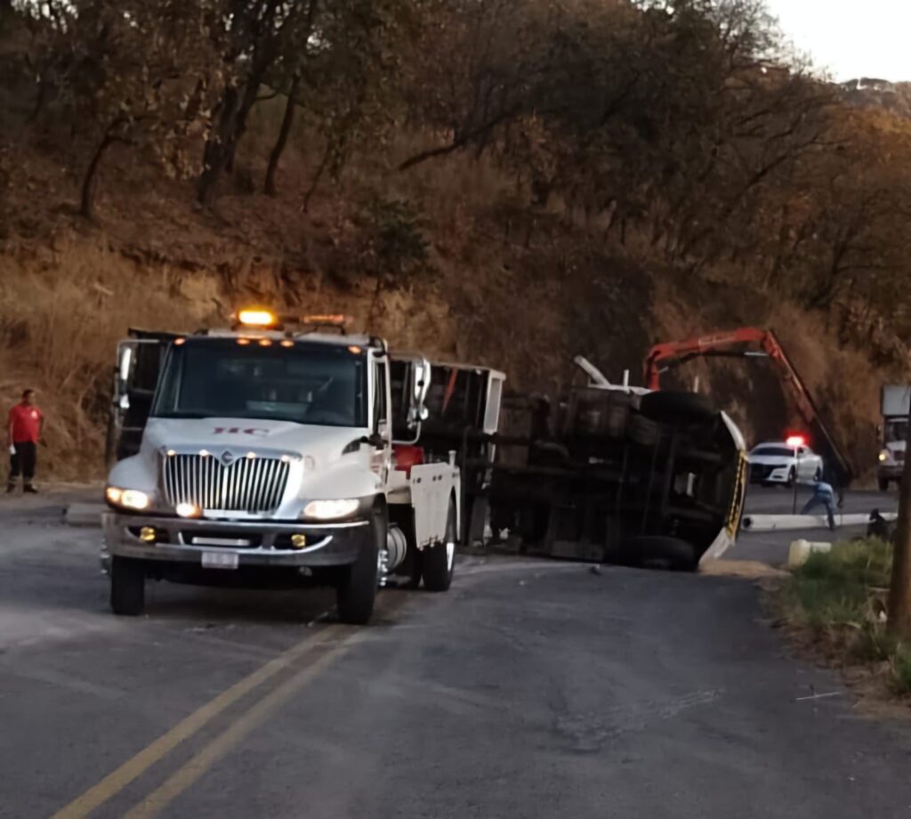 La pesada unidad quedo volcada a la altura del kilómetro 98, en el paraje conocido como La Ceiba, sobre la carretera Toluca-Tejupilco.