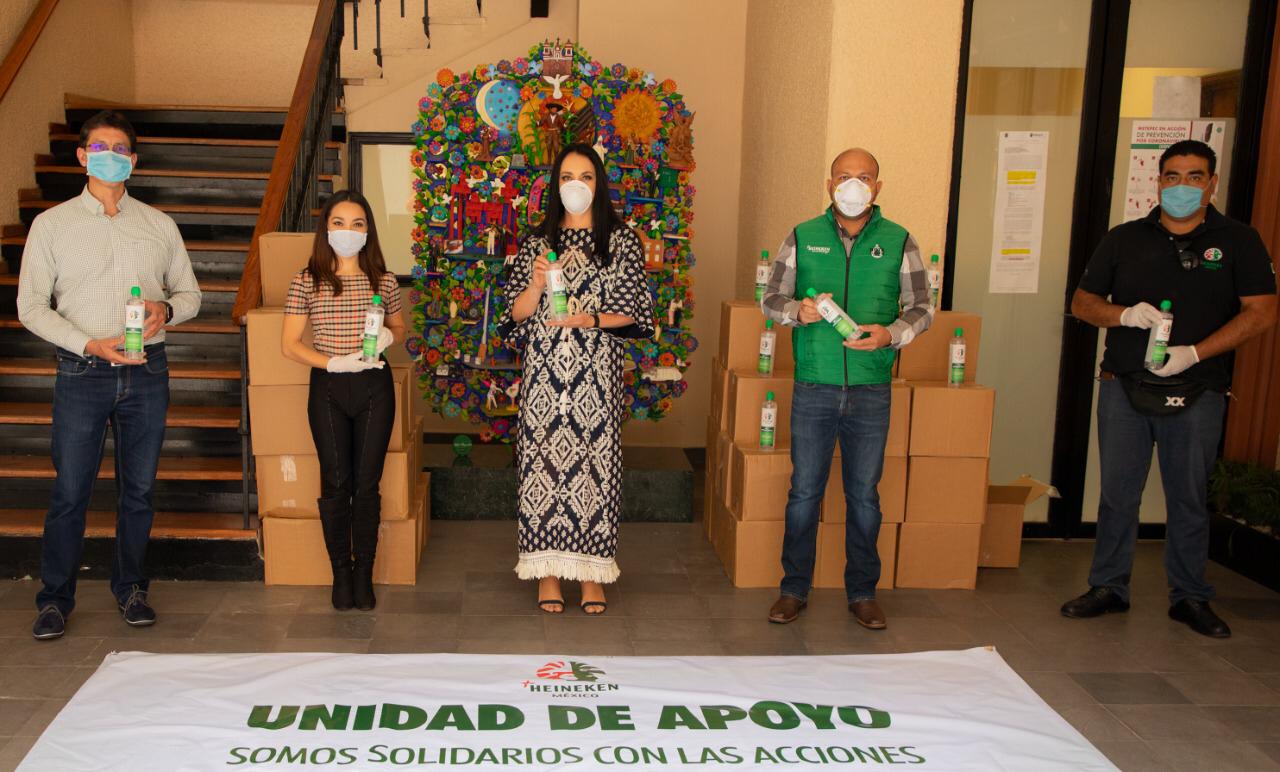 *Metepec, México; 15 de mayo de 2020.* El compromiso y liderazgo que realiza el ayuntamiento que preside Gaby Gamboa Sánchez, atendiendo puntualmente la contingencia por COVID-19, fue razón para que la empresa Heineken se sumara a relevante tarea con la donación de mil botellas de alcohol en gel.
