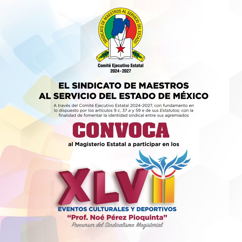 Toluca, Estado de México. – El Sindicato de Maestros al Servicio del Estado de México (SMSEM), encabezado por su Secretario General, Jenaro Martínez Reyes, lanzó la convocatoria para que docentes activos y jubilados participen en los XLVII Eventos Culturales y Deportivos, dedicados este año al Profesor Noé Pérez Pioquinta, precursor del sindicalismo magisterial.