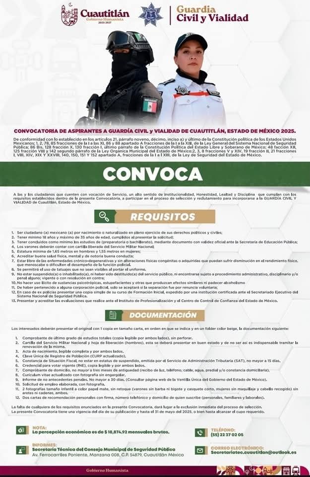 En un esfuerzo por fortalecer la seguridad y garantizar el bienestar de la ciudadanía, el gobierno municipal de Cuautitlán, encabezado por la presidenta Juanita Carrillo, ha lanzado la convocatoria para el proceso de selección y reclutamiento de nuevos elementos de la Guardia Civil y Vialidad.